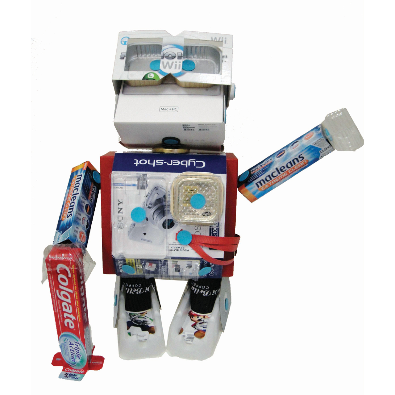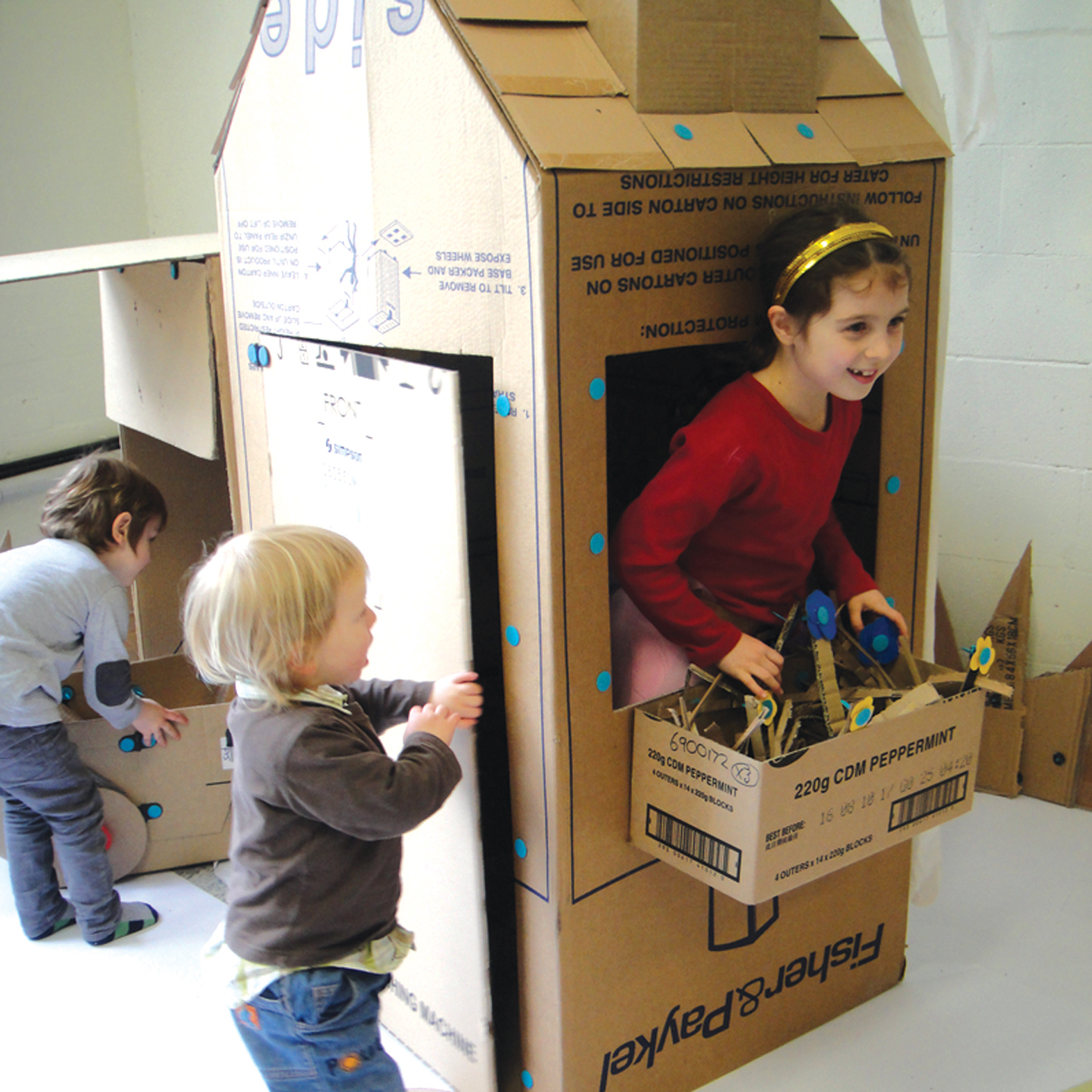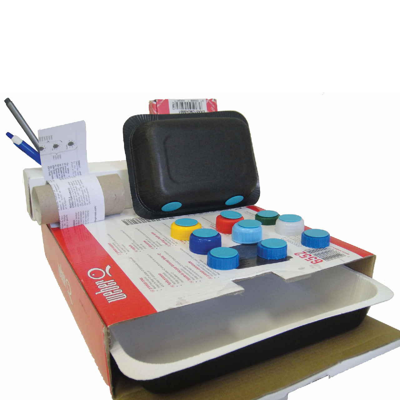Ezzel a készlettel és a háztartásban található csomagolóanyagokból, dobozokból, papírpoharakból, műanyag flakonokból és kupakokból most 10 gyermek készíthet egyedi játékot magának.