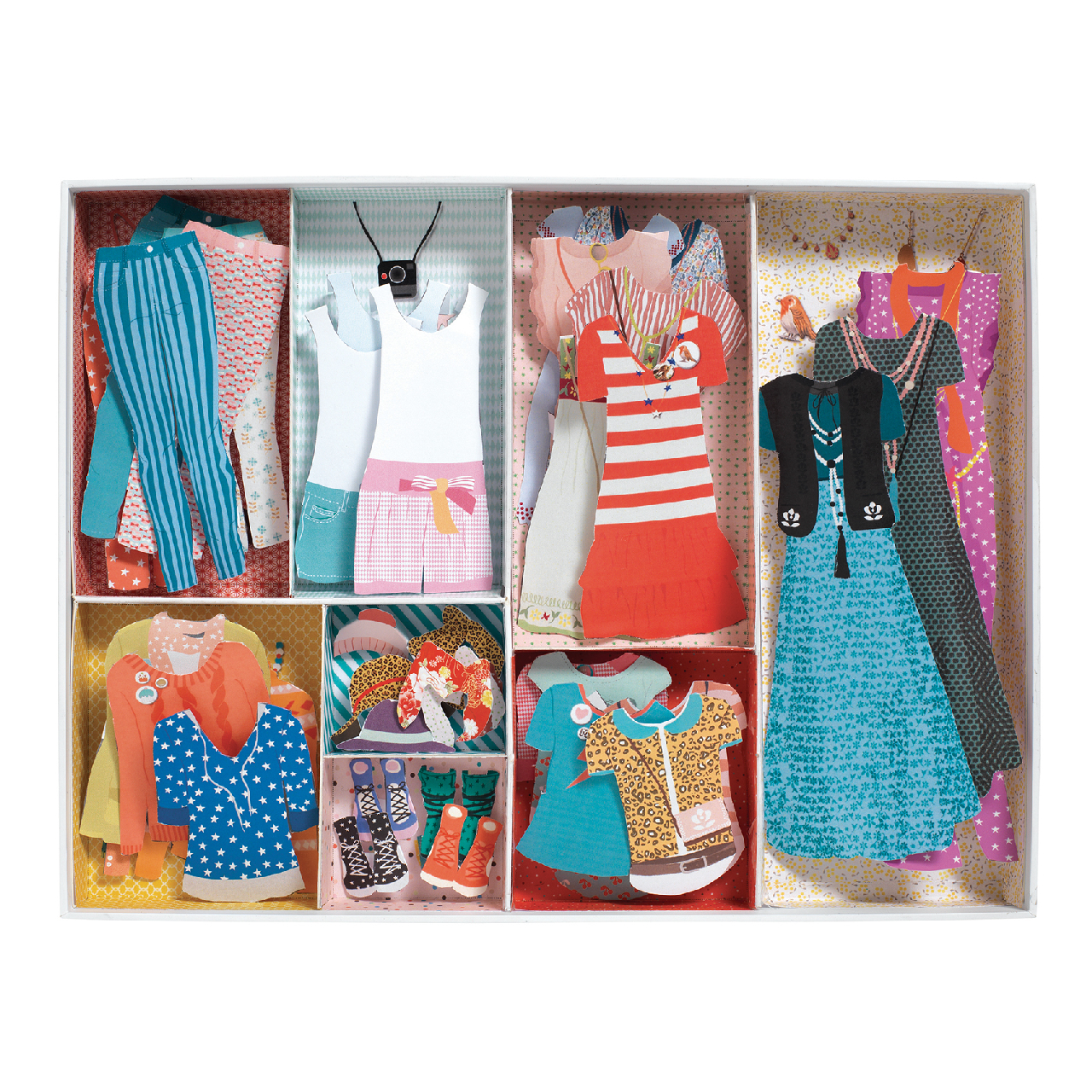 Hagyományos papírbaba öltöztető készlet, papírfülekkel rögzíthető ruhákkal.