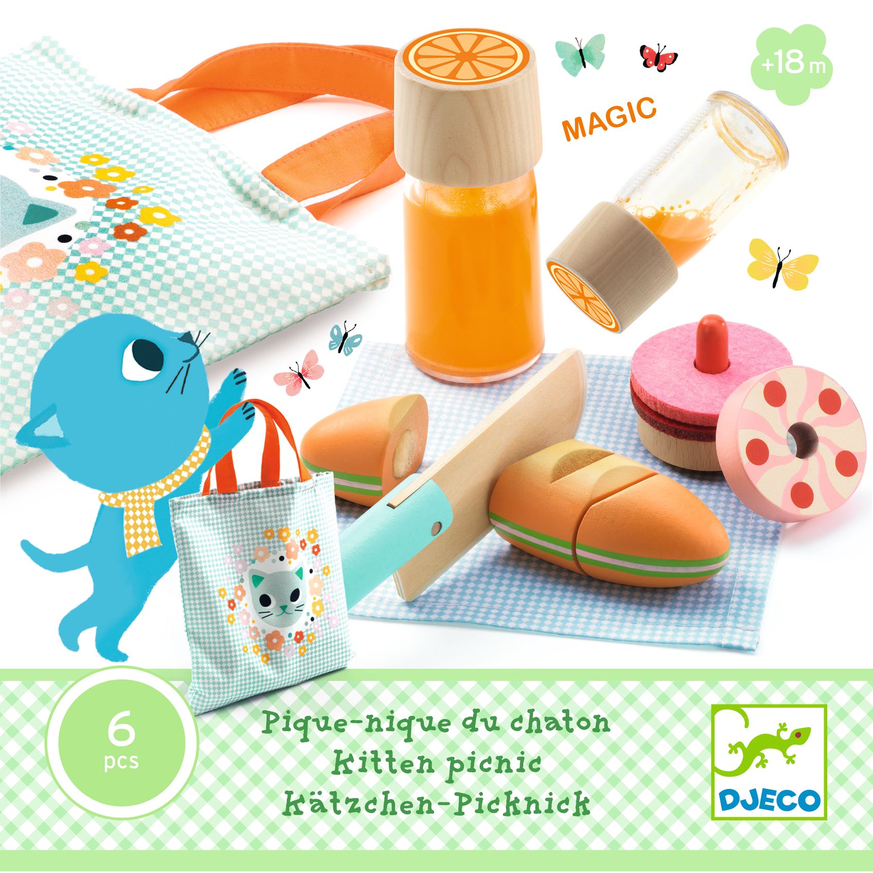 Egy csinos cicás szatyorban mindent megtalálható, ami ahhoz kell, hogy a kicsik előkészítsenek egy finom piknikhez való ételt, italt. A gyermek leteszi az asztalterítőt, és felteszi a szalvétát. Készen áll, hogy élvezze a pikniket: felvágja a szendvicsét és megkóstolja a süteményét, és nincs is jobb, mint egy frissítő ital a varázsflaskából!