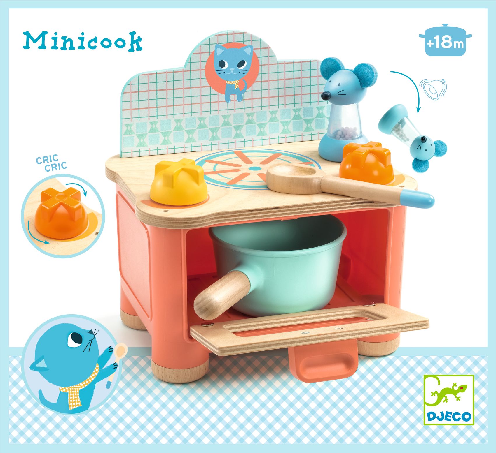 Kompakt tűzhely sütővel és főzőlappal amin a gyermek finom ételeket főzhet a serpenyő és a nagy fakanál segítségével. Tálalás előtt ne felejtse el fűszerezni az ételt az egérformájú sótartóval. Már 18 hónapos kortól ajánljuk. A sütő ajtaja könnyen nyílik és könnyen záródik. A beállító gombok hangot adnak. A játéktűzhellyel való játék fejleszti a motorikus készségeket és a képzeletet. Leköti a kisgyermek figyelmét, idejét, amíg a szülők is főznek, ő is utánozza a főzést.