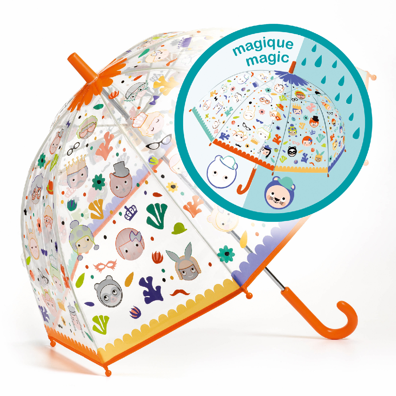 Gyönyörűen illusztrált esernyő, hogy feldobja az esős napot. Az átlátszó PVC lehetővé teszi a gyermek számára, hogy lássa, hová megy, a magas kupola pedig jobb fedettséget biztosít. Játékos illusztrációk tündéri pofikról.